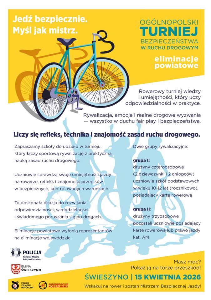 Już 15 kwietnia 2026 roku w Szkole Podstawowej w Świeszynie odbędą się eliminacje powiatowe Ogólnopolskiego Turnieju Bezpieczeństwa w Ruchu Drogowym. Wydarzenie jest skierowane do uczniów szkół podstawowych i ma na celu promowanie bezpiecznych zachowań na drodze oraz rozwijanie praktycznych umiejętności.