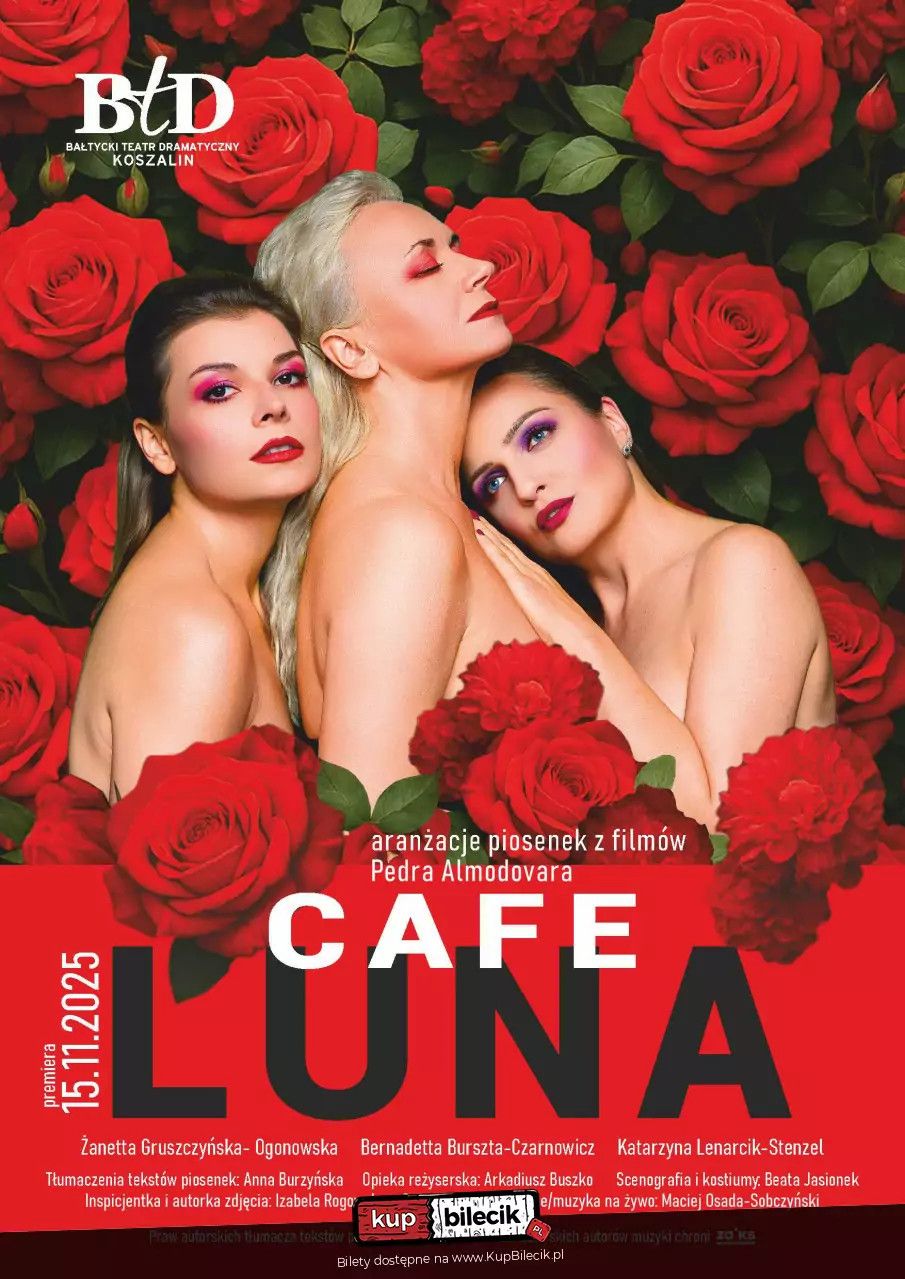 bilety: "Café Luna" - muzyczny spektakl inspirowany filmami Pedra Almodóvara, to pełna emocji opowieść o trzech kobietach, które spotykają się w podupadłym barze, by dzielić się swoimi historiami, marzeniami i ranami. W intymnej atmosferze miejsca, gdzie czas się zatrzymał, wybrzmiewają piosenki z filmów hiszpańskiego reżysera - pełne namiętności, tęsknoty i kobiecej siły. Café Luna - BTD artyści: Różni występującyMuzyczny spektakl inspirowany filmami Pedra Almodóvara, to pełna emocji opowieść o trzech kobietach, które spotykają się w podupadłym barze, by dzielić się swoimi historiami, marzeniami i ranami. W intymnej atmosferze miejsca, gdzie czas się zatrzymał, wybrzmiewają piosenki z filmów hiszpańskiego reżysera - pełne namiętności, tęsknoty i kobiecej siły. Bilety do nabycia na: KupBilecik.pl |